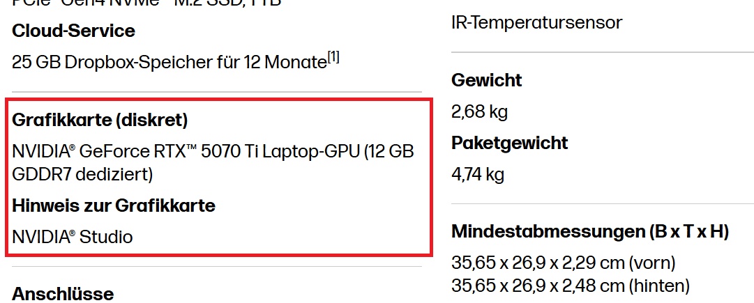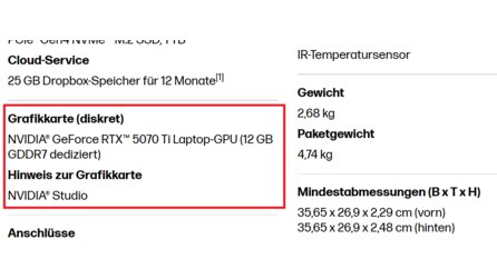 Alternate und Notebooksbilliger geben die Werte (soweit vorhanden) transparent in den technischen Spezifikationen des Laptops an, das ist vorbildlich. Bei Cyberport muss man dagegen bei einigen Modellen einen Blick in die Produktbeschreibung werfen, während es bei anderen Geräten keine Informationen gibt, obwohl der Hersteller die TGP angibt. Ein solcher Fall ist das MSI Titan: