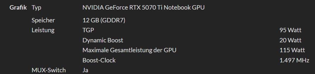 Wenn man jetzt noch bedenkt, dass zwischen 5060 und 5070 Ti auch noch die normale 5070 steht, verliert ihr durch die geringe TGP eine komplette Leistungsklasse. Oder anders ausgedrückt, ihr könnt für deutlich weniger Geld einen Laptop kaufen, der die gleiche Leistung mit RTX 5060 oder 5070 bietet.