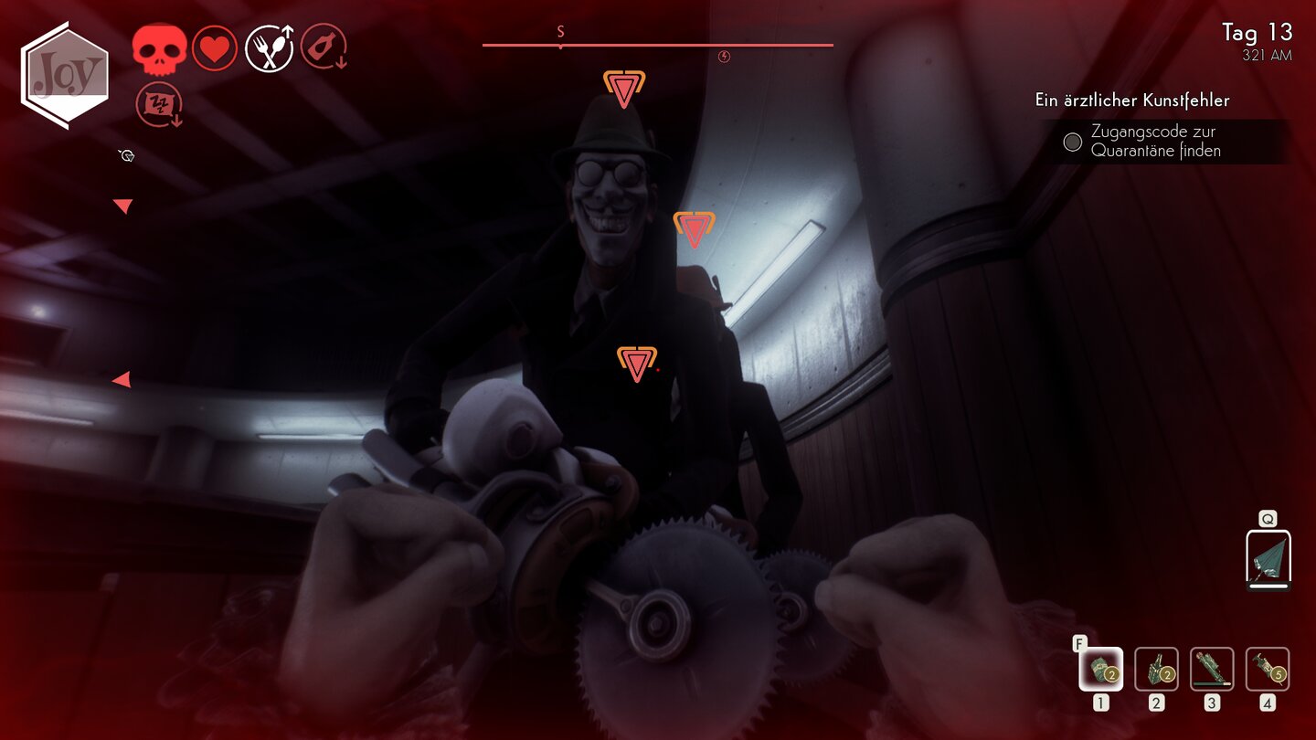 Diese werden nämlich schon hellhörig, wenn ihr beispielsweise sprintet, statt im normalen Tempo die Straßen entlang zu promenieren. Dieses Problem könnt ihr zwar mit dem entsprechenden Skill beseitigen, müsst aber dennoch in diesen Gebieten darauf achten, regelmäßig Freude-Pillen einzuwerfen. Diese zaubern euch nicht nur eine rosarote Brille vor die von der braungrüngrauen Spielwelt geplagten Augen, sondern sorgen auch dafür, dass die redlichen Bürger keinen Verdacht schöpfen.