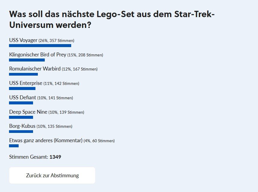 Auf dem zweiten Platz landet mit 15 Prozent der Klingonische Bird of Prey, gefolgt vom Romulanischen Warbird mit 12 Prozent. Auf einem immer noch respektablen Platz landen andere Versionen der USS Enterprise, von NX-1 bis E. 11 Prozent der Abstimmenden sprechen sich dafür aus, ein weiteres Schiff mit dem Namen Enterprise als Lego-Set umzusetzen.