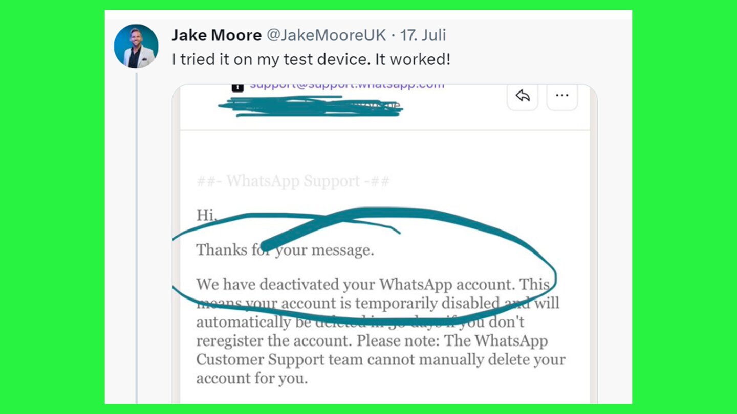 Diese E-Mail hat Jake Moore als Schwachstelle identifiziert. Denn wie Moore schreibt, ist es ihm mit großer Leichtigkeit gelungen, den WhatsApp-Account auf seinen beiden Testgeräten zu sperren.