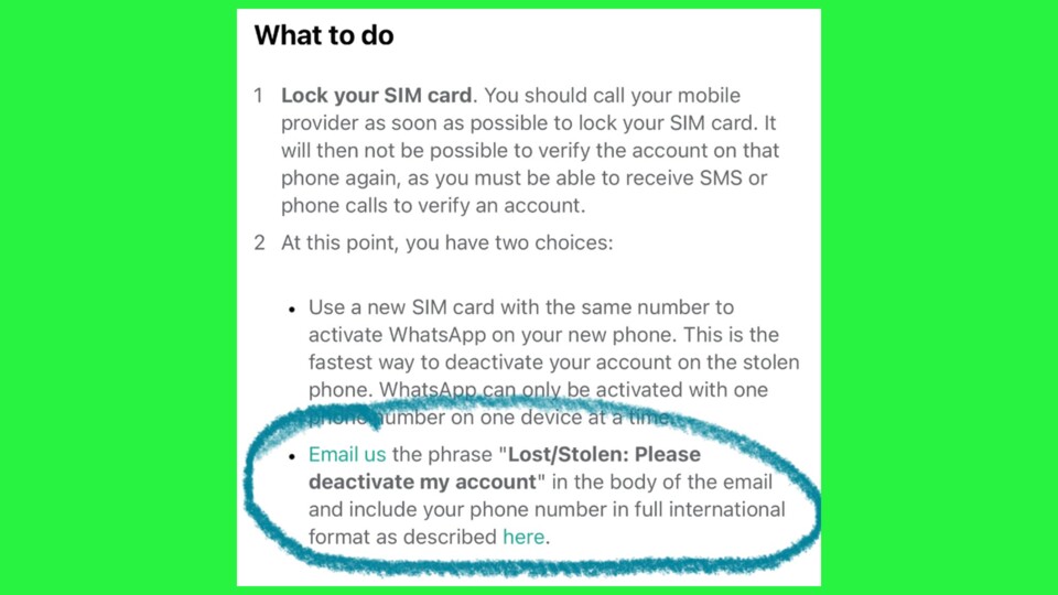 ➡️ Schritt 2: Nach erfolgreicher Sperrung habt ihr laut WhatsApp zwei Möglichkeiten. Entweder, ihr setzt eine neue SIM-Karte mit derselben Rufnummer wie zuvor in euer neues Handy ein. Oder ihr schickt eine E-Mail mit dem Inhalt »Verloren/Gestohlen: Bitte deaktiviert meinen Account« und der Angabe eurer Handynummer an WhatsApp.