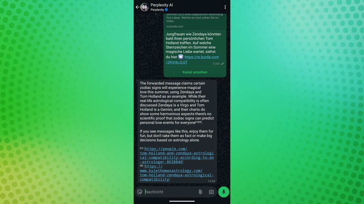 Testweise haben wir zudem einen Post aus dem Astrologie-Kanal einer großen deutschen Zeitschrift an den Chat mit Perplexity weitergeleitet.