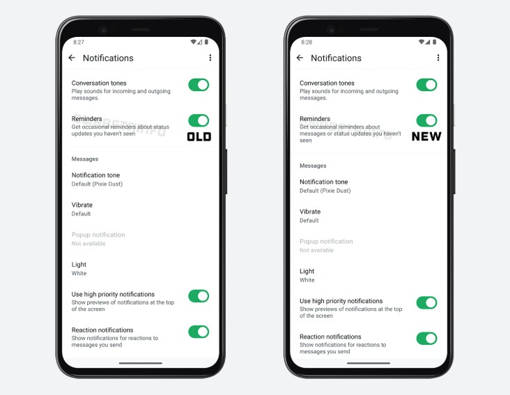 Damit wird ein neuer Reminder-Button erweitert, von dem die Tester erst vor gut einem Monat berichteten. Dieser erlaubt WhatsApp, den User gelegentlich an verpasste Statusmeldungen zu erinnern. Damit muss man sich nicht mehr durch Statusmeldungen und Chats scrollen, um mit seinen wichtigsten Kontakten auf dem neuesten Stand zu bleiben. Der folgende Vorher-Nachher-Vergleich stammt von WABetaInfo.