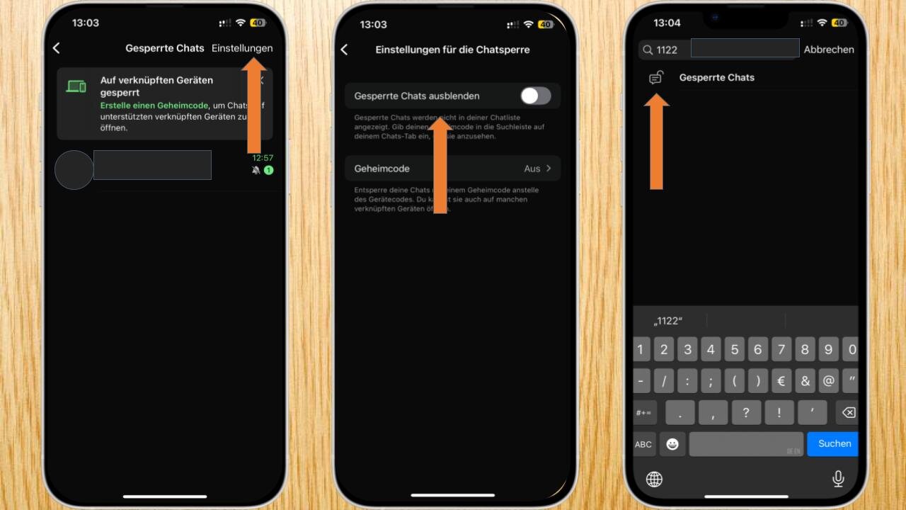 - Um eure Chats wiederzufinden, müsst ihr in der Suchleiste den eben erstellten Code eingeben und durch eure Face-ID bestätigen.