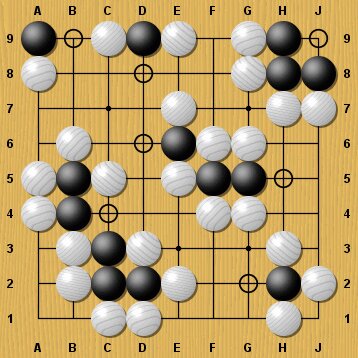 Der »Erfolg« dieser Stellung bezieht sich aber auf den gegnerischen Spieler; denn Ziel des Spiels ist es, gegnerische Gruppen zu umzingeln und somit den größeren Teil des Bretts zu kontrollieren. Je weniger Bewegungsspielraum die gegnerischen Gruppen haben, desto besser.