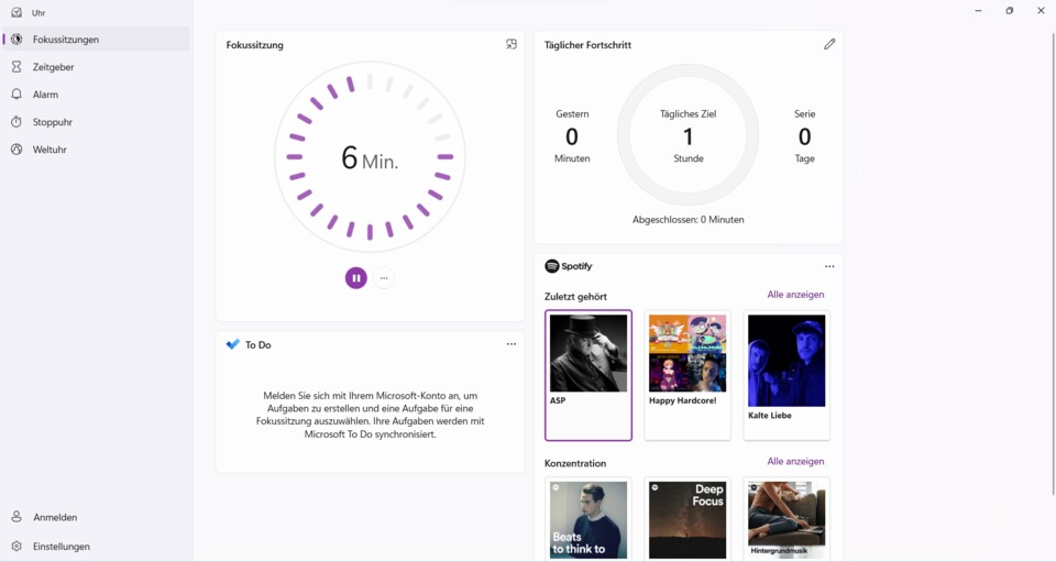 - Optional könnt ihr euch mit eurem Microsoft Konto anmelden und eure offenen To Dos verknüpfen. Außerdem könnt ihr die App mit Spotify verknüpfen und so während der Fokuszeit Hintergrundmusik laufen lassen.