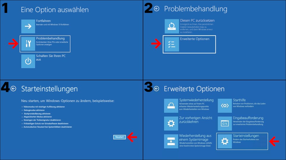- Hier wählt ihr, wie oben beschrieben, den Neustart sowie anschließend den gewünschten abgesicherten Modus aus.