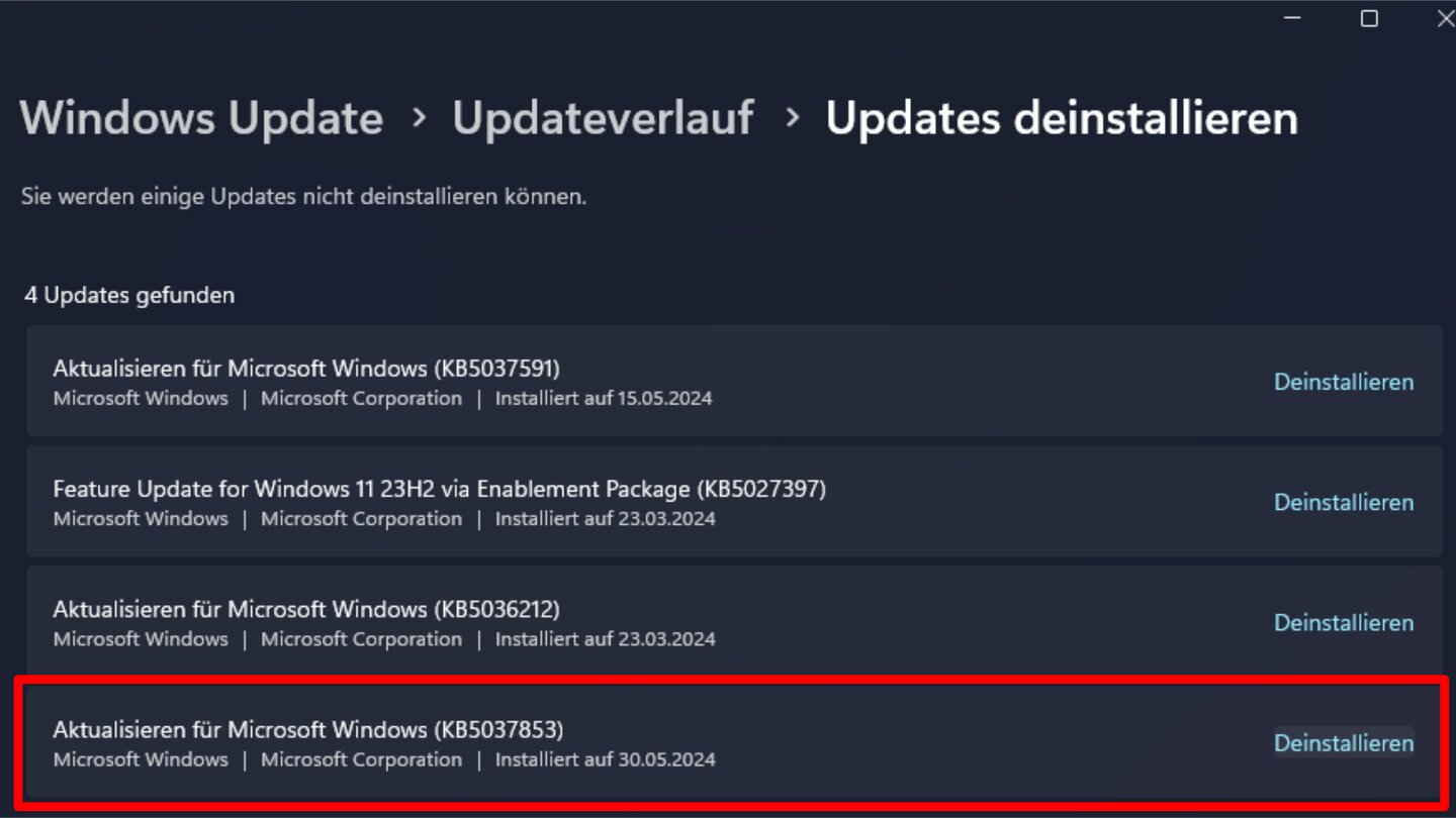 - Sucht in dieser Liste nach dem Eintrag mit dem KB5037853-Patch und klickt auf »Deinstallieren«, um das Update zu entfernen.