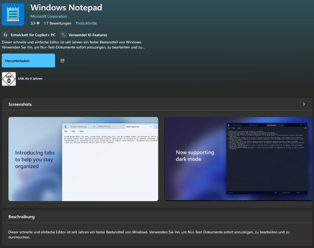 - Tippt »Windows Notepad« in die Suche im oberen Bereich des Stores ein.