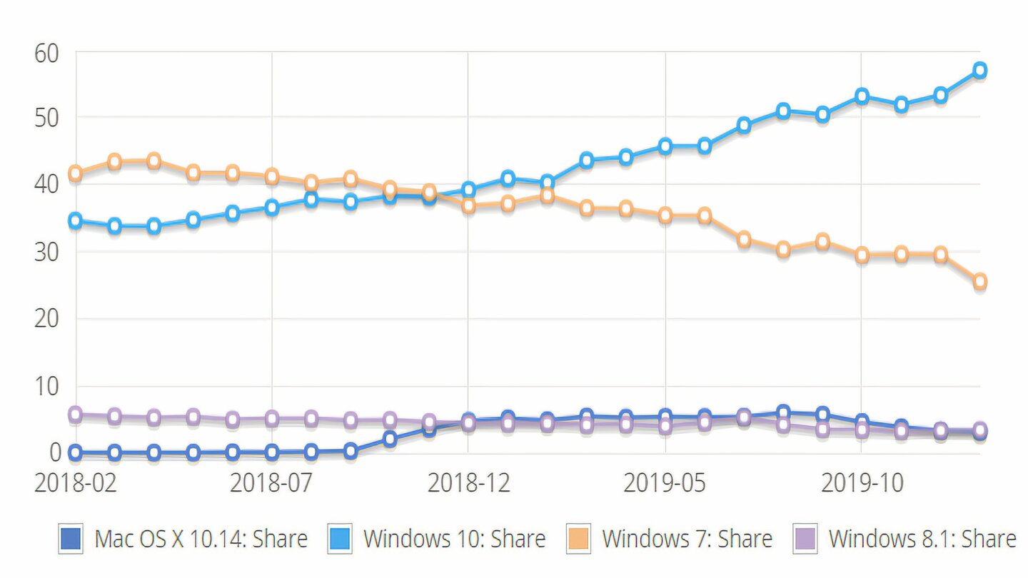 Über zwei Jahre gesehen ist dennoch ein klarer Trend in Richtung Windows 10 zu erkennen. Bis Ende 2018 lag Windows 7 in puncto Marktanteile noch vorn, ehe sich das Blatt Anfang 2019 zugunsten der neuesten Windows-Iteration wendete. Von Februar 2019 bis Januar 2020 verlor Windows 7 knapp 33 Prozent Marktanteil (13 Prozentpunkte), während Windows 10 um 43 Prozent (17 Prozentpunkte) zulegen konnte.