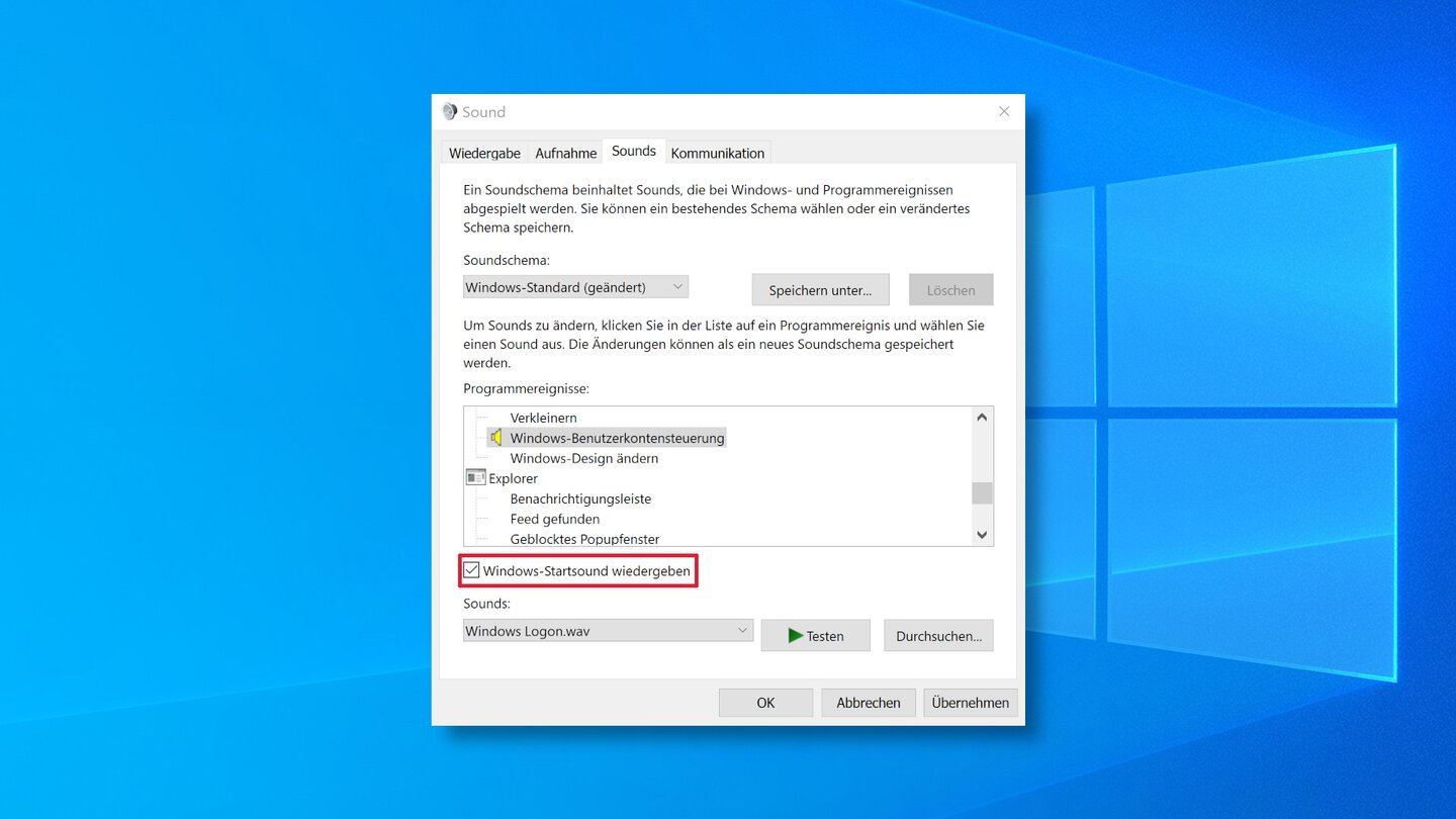 zu setzen (siehe auch den Screenshot unten). Allerdings ertönt dann nur der Startsound von Windows Vista und Windows 7. - Der unter den verschiedenen Systemsounds hinterlegte Klang