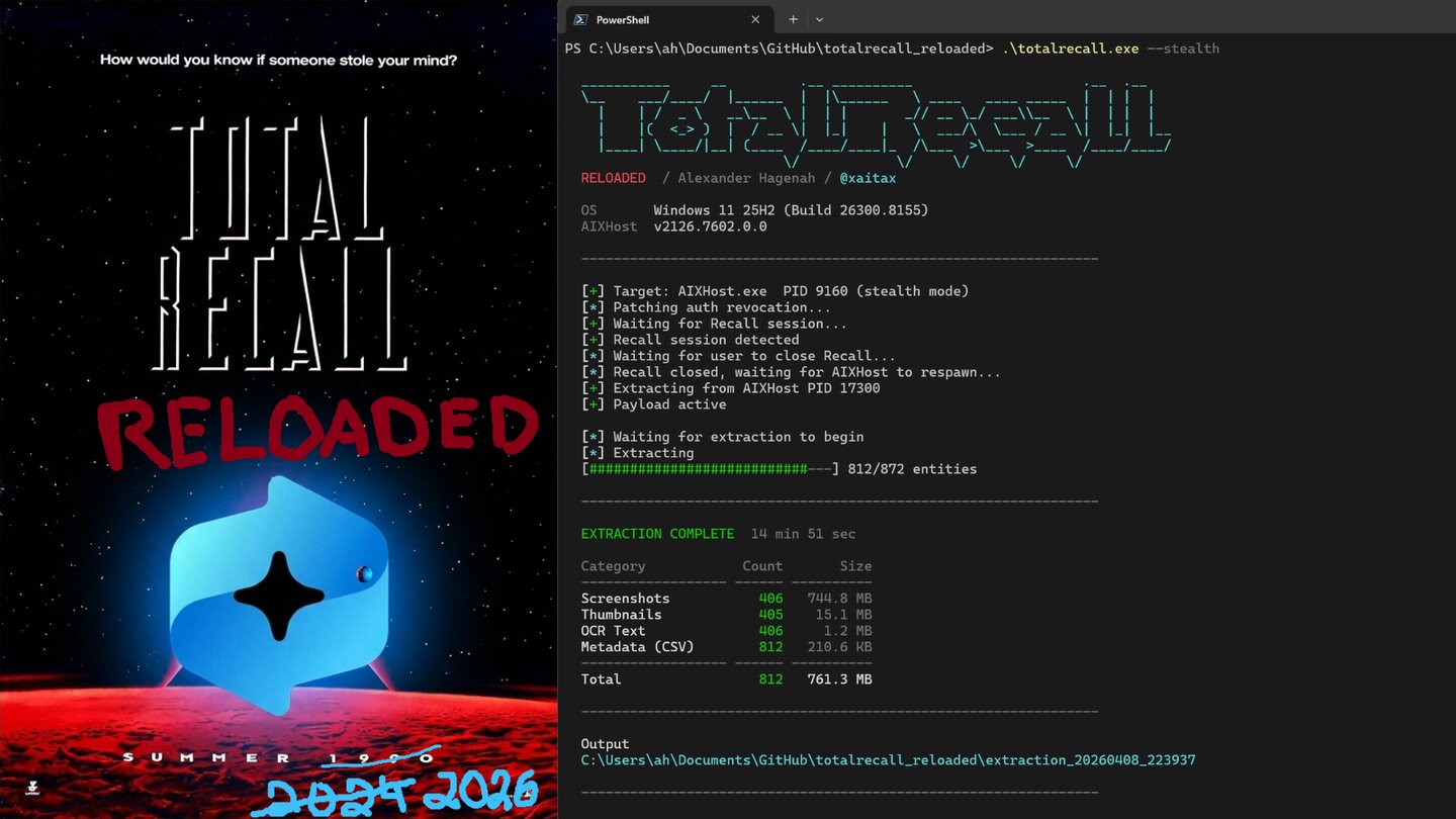 Alexander Hagenah (auch bekannt unter dem Pseudonym »xaitax«) hat nämlich »TotalRecall Reloaded« auf GitHub veröffentlicht. Das Tool extrahiert alle von Recall gespeicherten Screenshots, den per OCR ausgelesenen Text sowie die Metadaten – und das Ganze im Klartext, ohne dass Admin-Rechte oder ein Kernel-Exploit nötig wären.