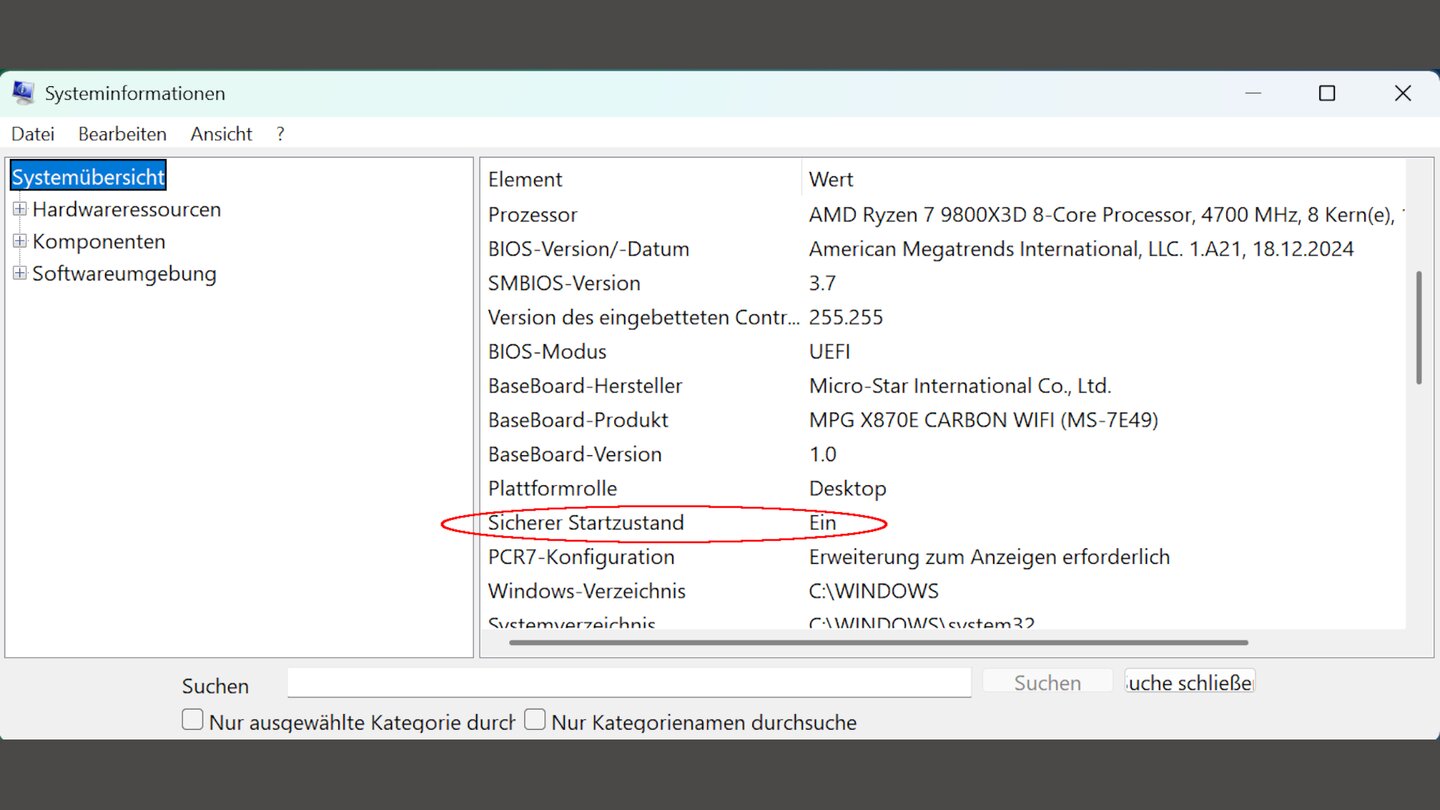 Ob Secure Boot aktiv ist, prüft ihr in Windows mit MSInfo32. Dort steht im Feld Sicherer Startzustand: Ein, Aus oder Nicht unterstützt.