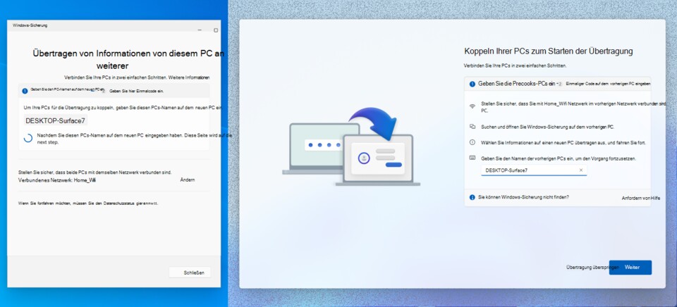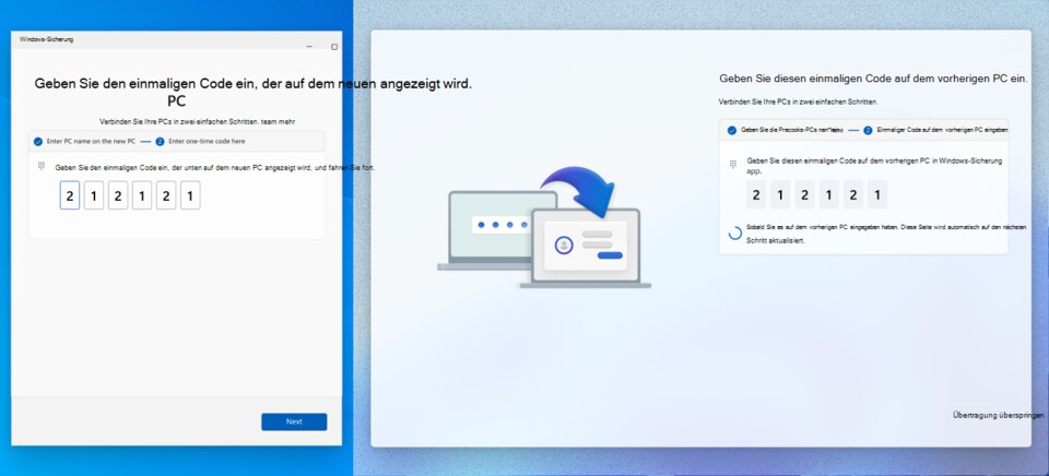 - Koppelt die beiden PCs im ersten Schritt. Dafür gebt ihr den angezeigten Namen des anderen PCs sowie im zweiten Schritt einen Sicherheitscode ein.