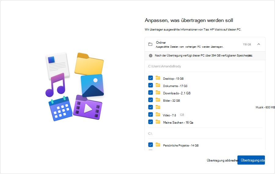 Was wird übertragen? Laut Microsoft werden alle Dateien, also Fotos, Videos, oder Dokumente, sowie Einstellungen auf den neuen PC übertragen.