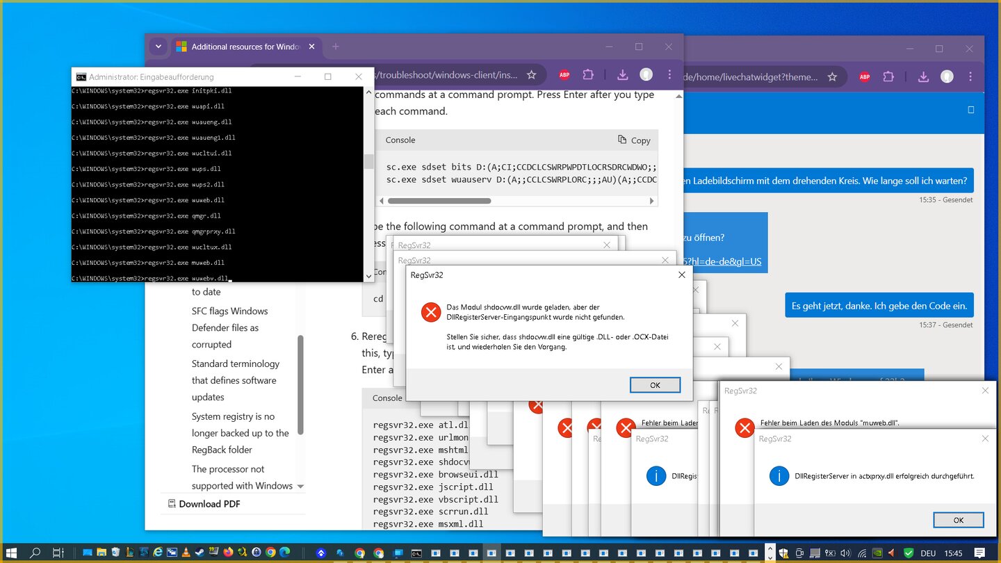 hat er über Kommandozeilen-Befehle versucht, die Update-Dienste zurückzusetzen beziehungsweise neu zu installieren. - Die entsprechenden Befehle kopierte er von offiziellen Windows-Webseiten, die für eine entsprechende Hilfestellung gedacht sind.