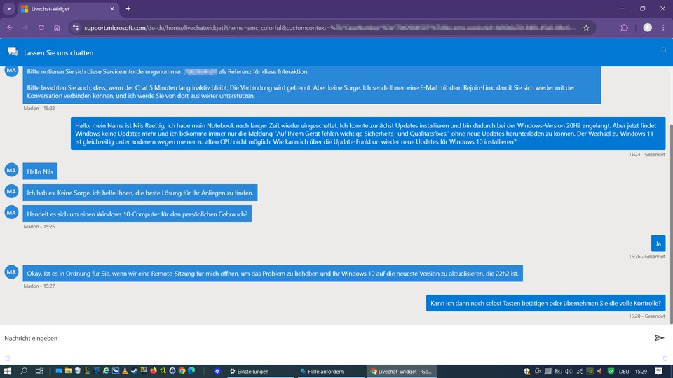 - Nach einer kurzen Schilderung des Problems wurde ich schnell gefragt, ob es für mich in Ordnung ist, meinen PC zur Behebung des Problems fernsteuern zu lassen: