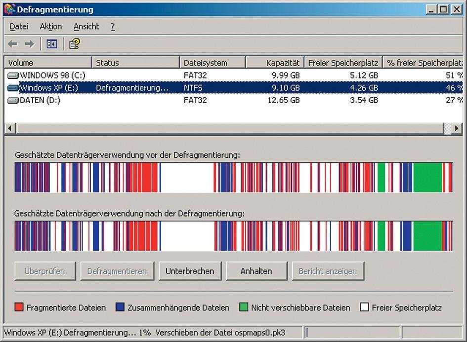 Nachdem Sie unter Punkt 5 eine Auslagerungsdatei festgelegt haben, sollten Sie jetzt Ihre Festplatten defragmentieren. Dabei werden Dateien auf der Festplatte geordnet und in mehrere Stücke (Fragmente) geteilte Dateien zusammengefügt. Hierzu starten Sie über »Start/Programme/Zubehör/Systemprogramme« die »Defragmentierung«. Wählen Sie die zu optimierende Partition und testen Sie mit »Überprüfen«, ob der Datenträger defragmentiert werden muss. Richten Sie sich nach der Empfehlung des Programms, und starten Sie den Vorgang mit »Defragmentieren«. Wiederholen Sie das mit den übrigen Laufwerken. Das dauert je nach Unordnung, Größe und Dateisystem der Datenträger bis zu mehreren Stunden.