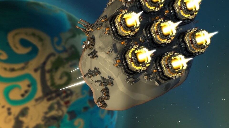 Das Alleinstellungsmerkmal von Planetary Annihilation soll die Größe sein - statt wie bei der Konkurrenz auf nur einem Planeten unterwegs zu sein, haben wir im PA ein ganzes Sonnensystem an der Hand. Andere Planeten können (und müssen) wir kolonisieren, kleinere Monde lassen sich sogar zu Waffen umrüsten: Wir packen ein paar riesige Triebwerke an den Trabanten und schicken ihn Richtung feindlichem Heimatplaneten.