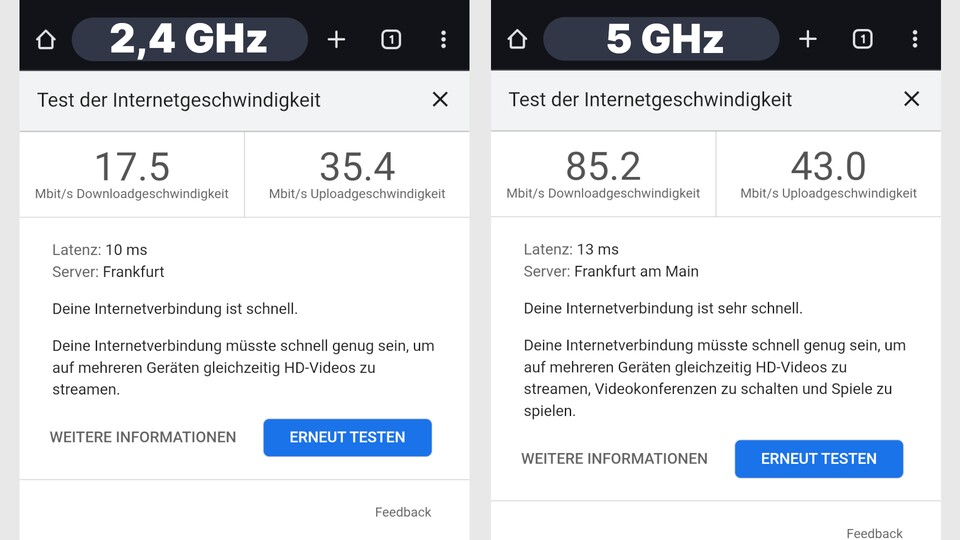 - Theoretisch kann zwar auch das 2,4-GHz-WLAN genug Bandbreite und eine niedrige Latenz für das lokale Streaming bieten, zumal diese Frequenz besser Hindernisse wie Wände durchdringen kann als das 5-GHz-WLAN. In der Praxis sieht das bei mir daheim aber anders aus.