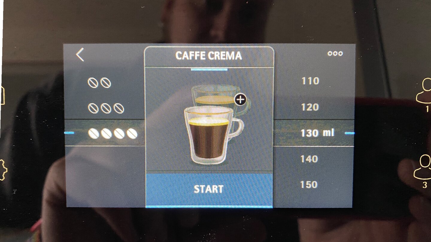 Ich habe die Wahl zwischen einer und vier Bohnen für Intensität und einer Füllmenge zwischen 80 ml und 180 ml in Zehnerschritten. Daraus ergeben sich verdammt viele Möglichkeiten! Zieht man in Betracht, dass ich das Mahlwerk zwischen drei verschiedenen Feinheiten justieren kann (je feiner desto intensiver das Aroma), schwirrt mir der Kopf.