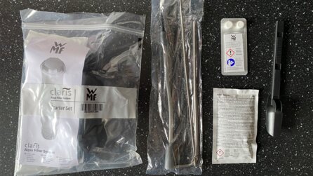 Der Lieferumfang bestand des Weiteren unter anderem aus dem Milchaufschäumaufsatz, Reinigungstabletten und einem Wasserfilter - und einem Mäppchen zum Aufbewahren, nett.