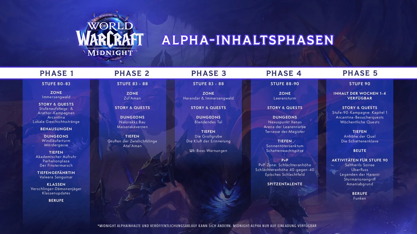 Los geht es schon ein wenigen Tagen, genauer gesagt am 2. Oktober 2025. Teilnehmende können aber nicht sofort auf alle neuen Inhalte der Erweiterung zugreifen. Stattdessen teilt Blizzard die Alpha in mehrere Inhaltsphasen auf.