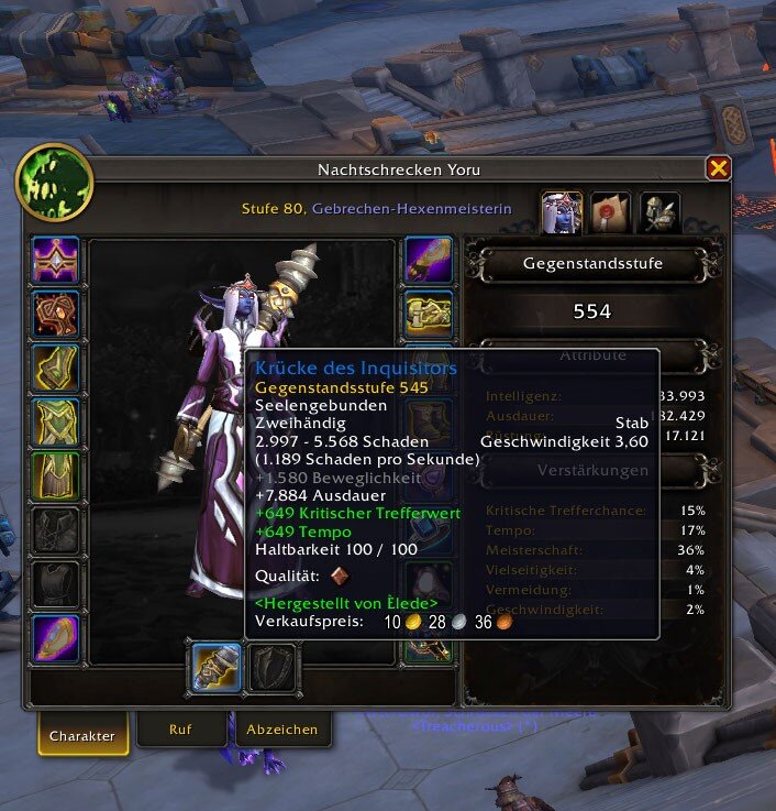 Übersetzt in WoW heißt diese Lebensweisheit: Ich bin ins Auktionshaus gegangen und habe mir den billigsten Stab mit entsprechendem Item-Level gekauft, den ich finden konnte. Konkret waren das jetzt etwa 1.000 Gold Lehrgeld (was jetzt kein gigantischer Verlust ist) und ein Stab, der den passenden Namen Krücke des Inquisitors