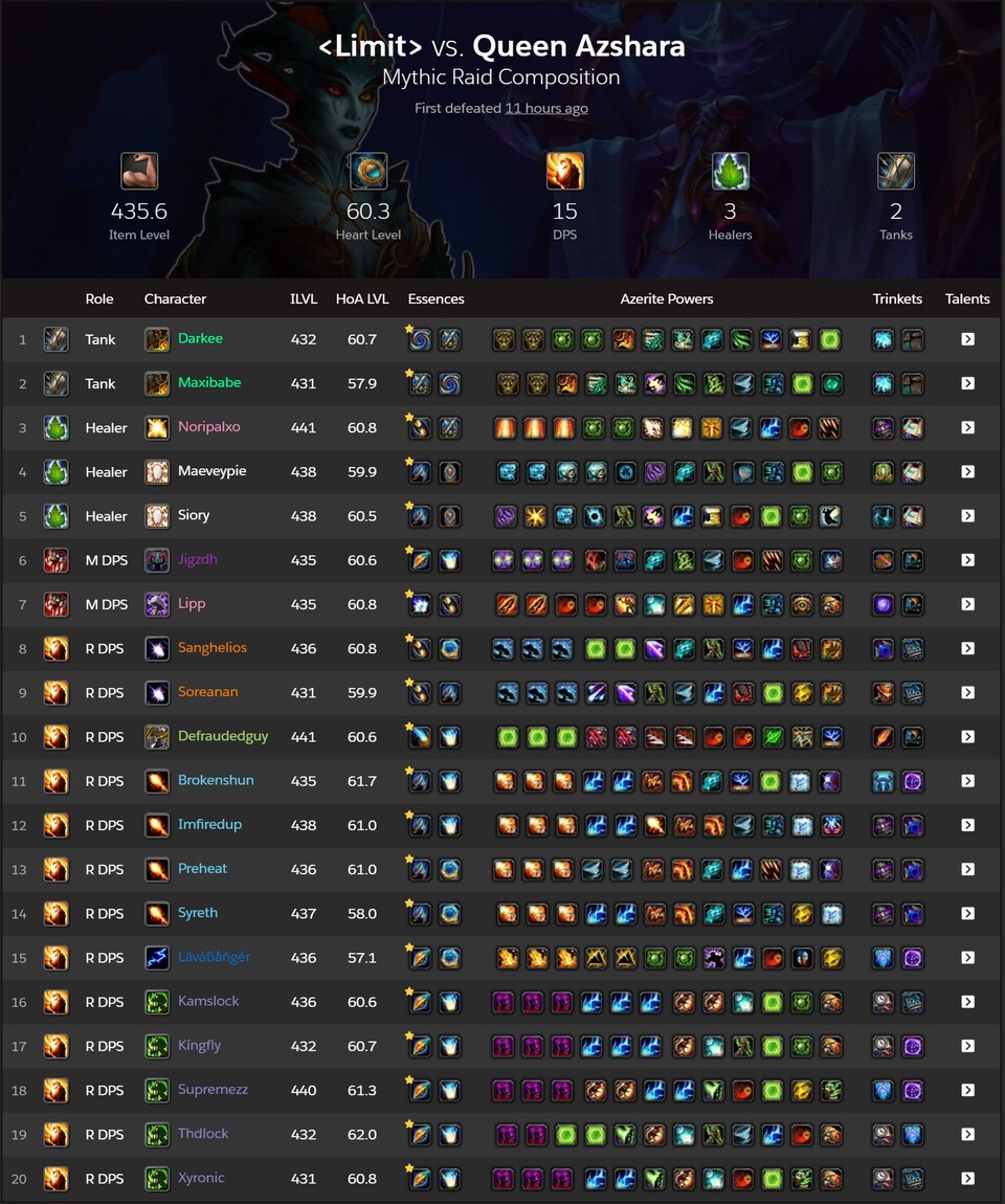 Anzahl der Versuche bis zum World First: Method brauchte insgesamt 356 Versuche bei Königin Azshara, um diese zu besiegen. Limit liegt hier bei 527 Versuchen, allerdings bearbeitet das Team die Bosse etwas anders als die Konkurrenz. Method nimmt sich insgesamt mehr Pausen, um über das Vorgehen zu sprechen, während Limit mehr Versuche aktiv am Boss macht und währenddessen die Strategie anpasst. Es sind also zwei unterschiedliche Herangehensweisen, die beide zum Erfolg führen.