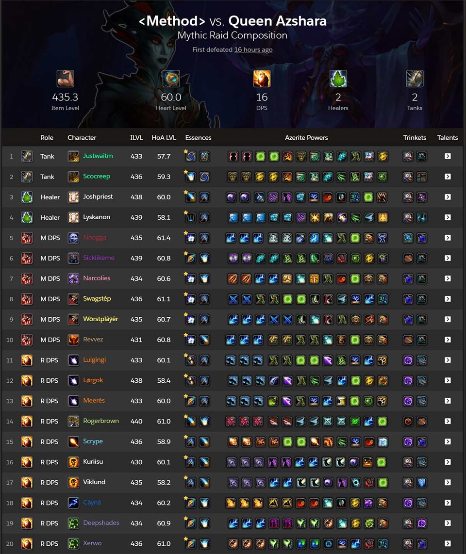 Weiterhin die Nummer 1: Method hat mit dem Sieg über Königin Azshara bereits den 13. World First Kill ihrer Gildengeschichte hingelegt. Der erste gelang ihnen 2012 mit dem World First Kill von »Der Wille des Kriegers« im Raid Mogu'shangewölbe aus der Erweiterung Mists of Pandaria.