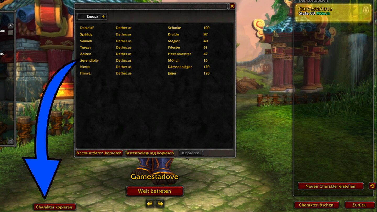 Alternativ könnt ihr wie gewohnt einen eurer sich auf dem Live-Server befindenden Charaktere kopieren. Aktuell sind diese aber noch nach dem Kopieren ebenfalls auf dem Server Torghast auf Level 50.