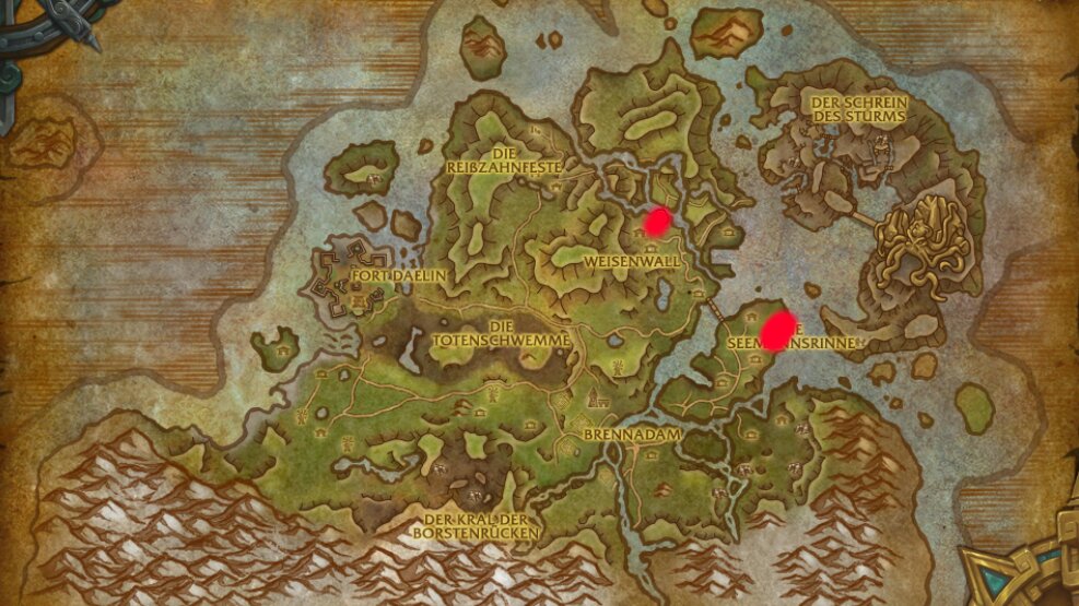 Auf der folgenden Karte findet ihr zwei Stellen markiert, an denen ich viele Anhänger von Lord Sturmsang finden: