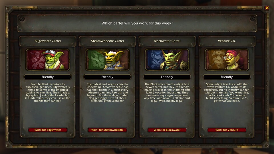 Genau wie schon in WoW 11.0 dürft ihr auch in Patch 11.1 wöchentlich zwischen neuen Pakten wählen, die euch verschiedenste Boni anbieten. Dieses Mal wählt ihr zwischen den vier rivalisierenden Kartellen. Dabei winken euch natürlich auch genug Erfahrungspunkte, um die Ruhmstufen der neuen Fraktion zu erklimmen. Ab Ruhmstufe 19 gibt es auch hier wieder ein neues Reittier - natürlich in Form einer Rakete.