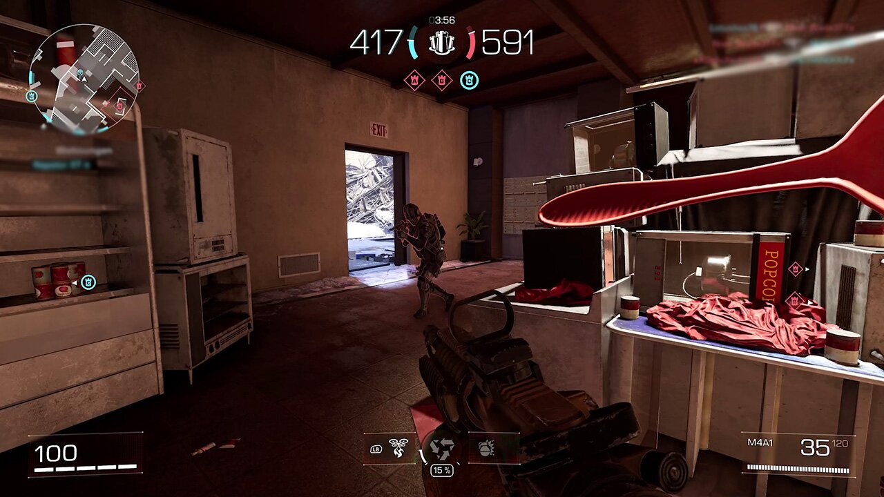 Das Movement von XDefiant ist wie das Gunplay: schön zackig und flüssig. Allerdings ist nicht immer ersichtlich, wo man hochklettern kann und wo nicht. Die Wand da hinten? Kein Thema. Die Kiste da drüben? Unmöglich. Woran ich das erkenne? Ausprobieren! Immer mal wieder gibt’s gelbe Markierungen, aber anderswo fehlen sie und ich komme da trotzdem hoch. Diese Inkonsistenz nervt.