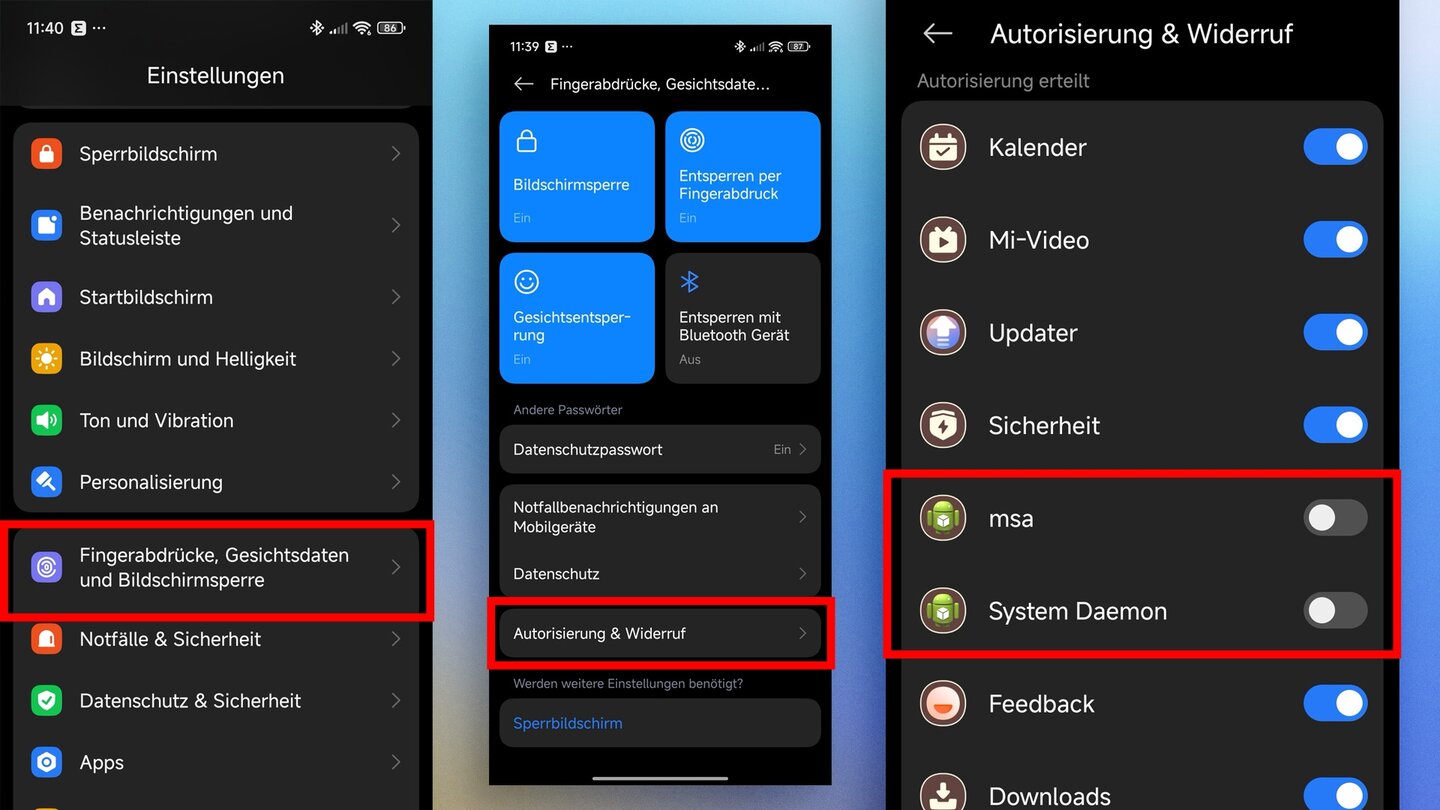In der Einstellung-Seite »Autorisierung & Widerruf« habt ihr noch die Möglichkeit, den »System Daemon« zu deaktivieren. Die Option befindet sich bei den meisten Xiaomi-Handys direkt unter »msa«.