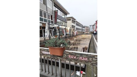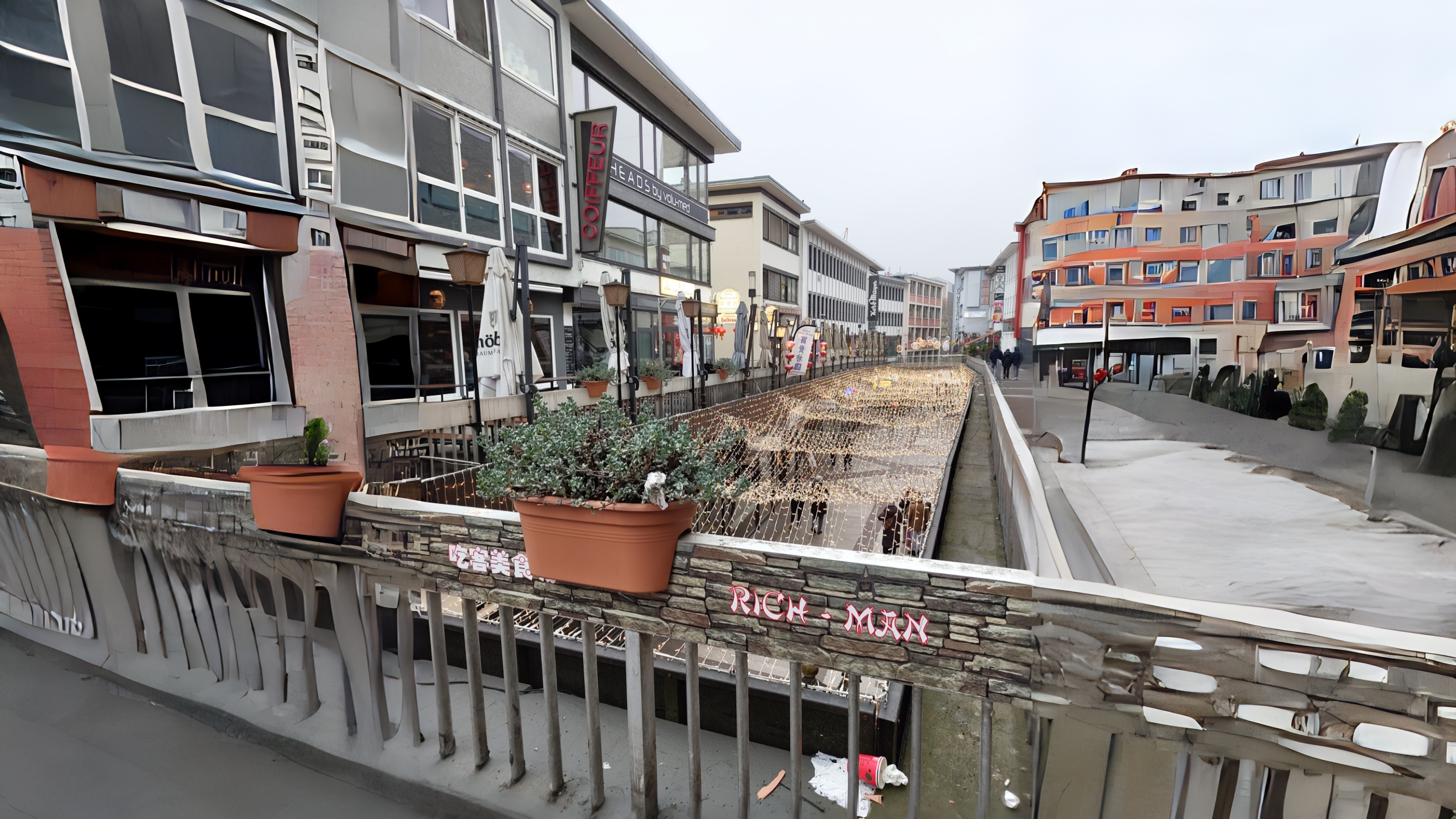 Hier sollte ein Straßenfoto vom Hochformat ins Querformat konvertiert werden. Dabei müssen sehr viele neue Bildinformationen generiert werden. Die KI scheint auch nicht wirklich gut mit Gebäuden, Fenstern und anderen geometrischen Details zurechtzukommen.