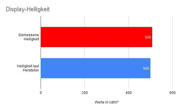 Die maximale Helligkeit geben sowohl XMG als auch BOE mit 500 cd/m² an. Diese Angaben wurden während meines Tests sogar leicht übertroffen, ich konnte bis zu 508 cd/m² messen. Damit eignet sich der Bildschirm auch für helle Umgebungen.