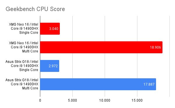 Im Vergleich mit dem Asus Strix G18 liegt das Neo sowohl im Single- als auch im Multi-Core-Benchmark vorn. Und das, obwohl bei beiden Geräten ein Intel Core i9 14900HX unter der Haube werkelt.