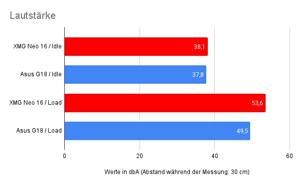 So viel Leistung in einem relativ flachen Gehäuse lässt sich nicht leise kühlen, das muss man einfach klar so sagen. Im Idle ist das Neo 16 etwa so laut wie das Asus G18, während es unter Last fast 4 Dezibel lauter wird.