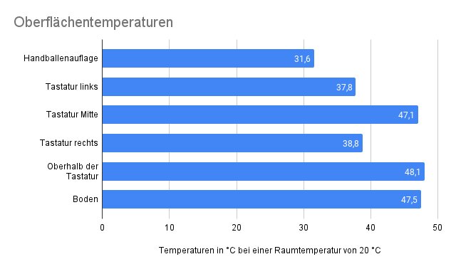 Die Oberflächen werden bei der vollen Auslastung von CPU und GPU zum Teil sehr warm. Die Handballenauflage bleibt mit rund 32 °C noch relativ kühl. Bei der Tastatur habe ich in der Mitte Spitzenwerte von bis zu 47 °C gemessen. Das ist mir persönlich zu warm.