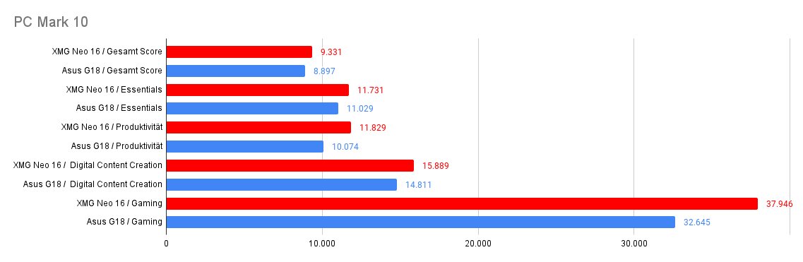 Das gleiche Bild zeigt sich im PC Mark 10, das Neo 16 liegt in allen Bereichen vorn. Speziell im Gaming-Benchmark kann das XMG Notebook mit seiner potenten Grafik punkten.