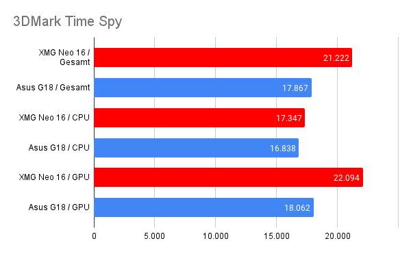 Wenig überraschend gewinnt das Neo 16 auch jede Einzelwertung im 3DMark Time Spy. Bei der CPU-Wertung ist der Abstand zum Asus Notebook gering, beim GPU-Teil liegt die RTX 4090m vorn.