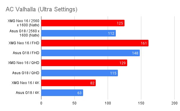 Bei AC Valhalla erzielt das Neo 16 deutlich über 100 FPS, erst bei einer Auflösung von 4K werden nur