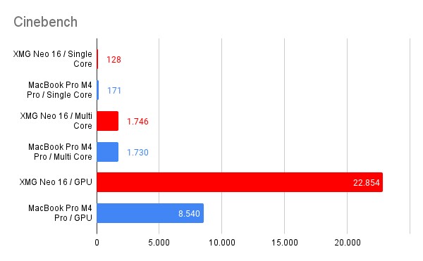 Cinebench habe ich neu in den Benchmark-Parcour aufgenommen. Zum aktuellen Zeitpunkt gibt es nur Vergleichswerte mit dem Apple M4 Pro Chip.