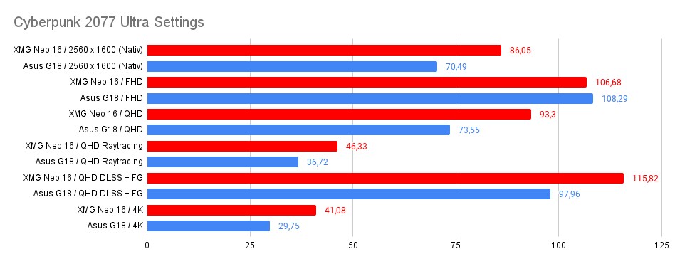 PC-Spiele sind das Haupteinsatzgebiet des Neo 16. In Cyberpunk 2077 gewinnt die RTX 4090m auch recht deutlich gegenüber der RTX 4080m. Die einzige Ausnahme ist Full-HD-Auflösung, hier läuft die 4090m ins CPU-Limit und ist nicht schneller unterwegs als der kleine Bruder.