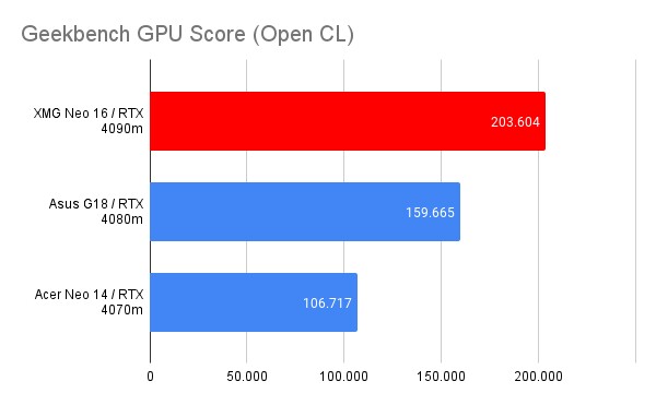 Im GPU-Teil des Benchmarks zeigt die RTX 4090m dann, was in ihr steckt. Die im Asus Strix G18 installierte RTX 4080m verfügt wie die Grafikkarte im XMG Neo 16 über eine TGP von 175 Watt, rein auf die Verlustleistung bezogen passt der Vergleich also.