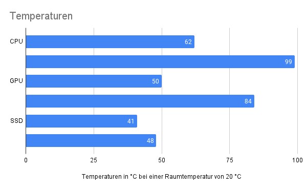 Weniger gefallen haben mir die zum Teil hohen Oberflächentemperaturen und die unter Last hohe Lautstärke. Das muss man allerdings auch ein wenig in Relation zur Leistung und der damit verbundenen Abwärme setzen. Mehr als 200 Watt müssen erst mal aus einem Notebook-Gehäuse abgeführt werden.
