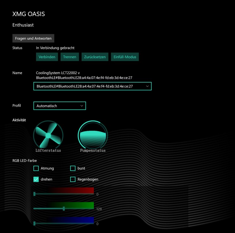 Ist das passiert, könnt ihr in der herstellereigenen Control-Center-Software über Bluetooth die Oasis-Wasserkühlung mit eurem Laptop verbinden. Eine Verbindung direkt über die Windows Bluetooth-Einstellungen konnte ich dagegen nicht vornehmen, nehmt als am besten direkt den Weg über das Control Center. Bei entsprechender Last sollte sich die Wakü nun automatisch zuschalten.