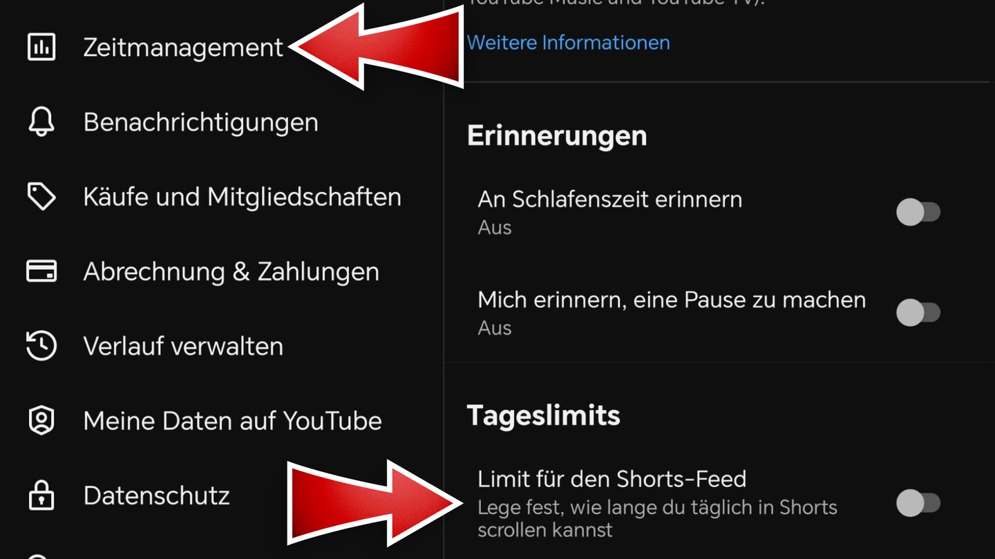 Den neuen Schalter zum Unterbinden von Shorts findet ihr in der YouTube-App unter Einstellungen → Zeitmanagement → Tageslimits → Limit für den Shorts-Feed. Schaltet die Option ein und wählt »0 Minuten« als Zeitlimit.